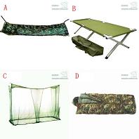 A: Art No.: CB10117 Item: hammock Material: polyester/nylon cotton canvas/polyester canvas ---------------------------------------------------------- B: Art No.: CB10105 Item: camp bed Material: polyester/cotton/nylon ---------------------------------------------------------- C: Art No.: CB10109 Item: mosquito net Material: polyester ---------------------------------------------------------- D: Art No.: CB10120 Item: sleeping bag Material: polyester