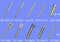Type: 1. Swage stud with nut, 2. Swage terminal fork, 3. Eye terminal, 4. Lag screw terminal, 5. Internal threaded terminal, 6. Internal threaded dome head, 7. Internal threased flat head, 8. Dome head terminal, 9. Swageless fork terminal, 10. Swageless eye terminal. |