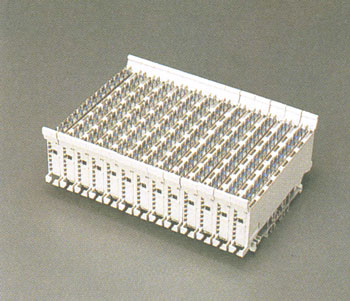 This Terminal Block is a module type for different volume of subscriber application and employed the quick-clip term pin for labour cost saving. The 104 pair Terminal Block unit consists 13 modules of 8 pair individual module and was mounted on the special design aluminium rail bracket for MDF horizontal mounting to provide the wire jumping of MDF. |