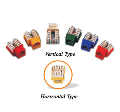 Cat. 5e Keystone Jack Horizontal Type Dual Tyep Terminal Block accept both Krone & 110 punch down tool Color : Black, White, Blue, Red, Green, Yellow |