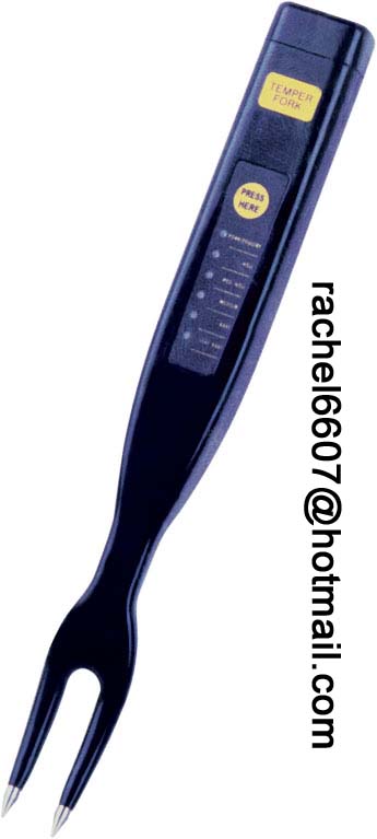 ITEM: Thermometer Fork with LED MODEL: S-210 SPECIFICATION: *Read food Temperature Instantly from rare to well done. *Sensitive stainless tip for exactly conduct heat. *Can be used as a fork. *Durable ABS plastic body. *IC panel control design. *Including two AA batteries *Size: 11-1/4" *GS/CE approval (food contact approval). PACKAGE: *Inner Box:38.5*21*18 CM(12PCS/BOX) *Carton Size:39.5*22*56 CM(3BOX/CTN) *G.W.:7 KGS *N.W.:5.5 KGS