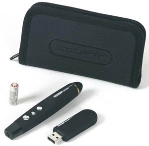 General Description 1. To make your presentations flow continuously, the Super Pointer integrates the page up/down functions with a laser pointer on a remote hand held device using a wireless technology. The Super Pointer's attractive compact design enables mobility of up to 15meters from the laptop/PC while still maintaining a full navigational control of your presentations. 2. The Super Pointer does not require any software and PC programming and take just a few seconds to install and use. Key Features 1. Plug and lay function No PC programming and S/W 2. Working on any computer On any computer using a USB Port 3. Remote control range over 15m with a very low power Eliminates LOS problems encountered with IR systems. 4. Transmitter identification Use thousands of ID number to avoid multi-user interferences