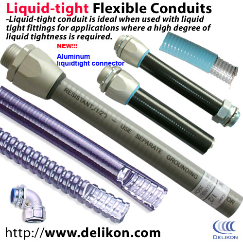 Liquidtight Flexible Conduits and NEW ALUMINUM connectors ( Protecting wiring in wet locations ) Liquid-tight conduit is ideal when used with liquid-tight fittings for applications where a high degree of liquid tightness is required. This product is suitable for a number of general purpose wiring applications and ideal for environments with lots of water, coolant, and vibrations such as machine tool workshops.
