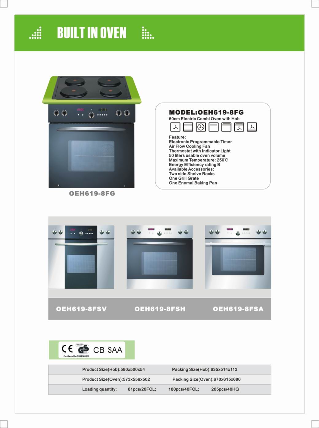 *CE,GS,ROHS approval *60cm ElectricMultifunction Oven *Electronic programmable timer *Air flow cooling fan *Thermalstat with indicator light *50L *Max Temperature:250C *Energy Efficiency rating A *Accessories:two side shelve Racks,one grill grate,one enamelled baking pan |