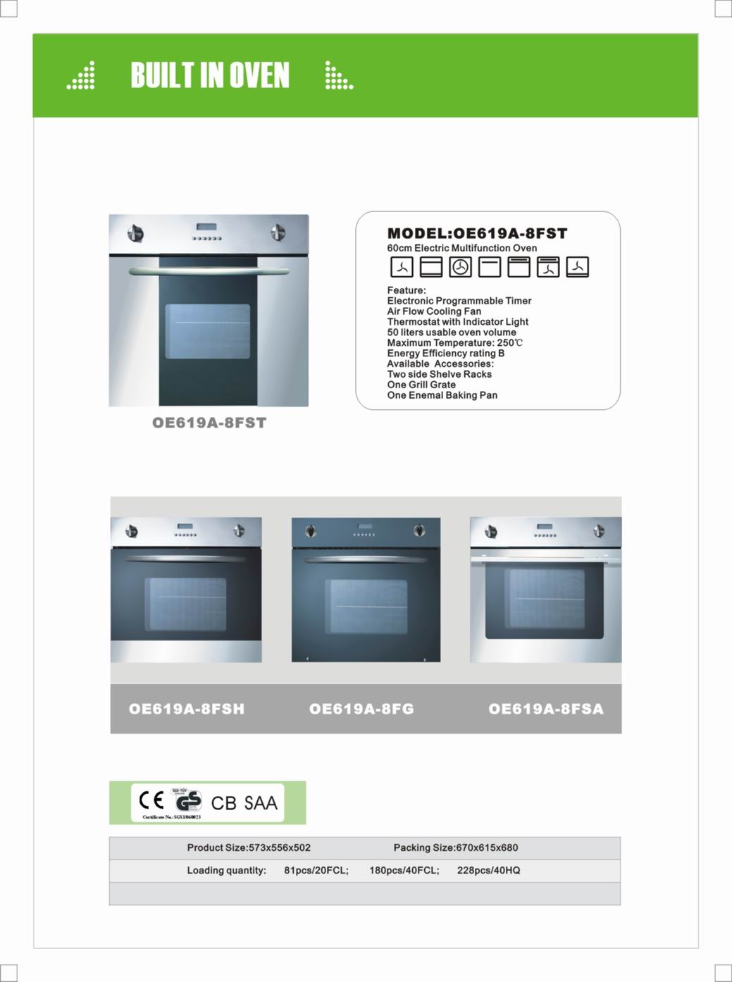 *CE,GS,ROHS approval *60cm ElectricMultifunction Oven *Electronic programmable timer *Air flow cooling fan *Thermalstat with indicator light *50L *Max Temperature:250C *Energy Efficiency rating A *Accessories:two side shelve Racks,one grill grate,one enamelled baking pan |