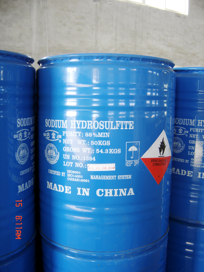 Jinhe Sodium Hydrosulfite Factory Co., Ltd. is the leading company of Shandong Jinhe Industrial Co., Ltd. This factory was established in 1990. The main product is sodium hydrosulfite of "GUJIN" with the capacity of 40,000 metric tons each year. The annual value is USD25,000,000, including export value of USD10,000,000. Shandong Jinhe Industrial Co., Ltd. that is one ISO9001 and ISO14001 certified manufacturer in China, that is the biggest manufacturer of sodium hydrosulfite in North China, own famous brand of "GU JIN" sodium hydrosulfite."Quality first, Credit good" is our consistent principle. Sodium hydrosulfite is used in textile industry for vat dyeing, reduction cleaning, printing and stripping, also used in bleaching paper pulps, especially mechanical pulp, bleaching kaolin clay and food stuffs. Specification: 85%, 88% and 90% Packing:50kg iron drums with double inner plastic bags
