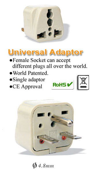 Item No.: KT-18 - Female Socket can accept different plugs all over the world. - Rated : 15A 250V - Color : Black or Light Gray - Suitable for Area : Taiwan, U.S.A., Japan, Canada.(220V only) - World Patented. - CE Approval. - RoHS Compliant. |