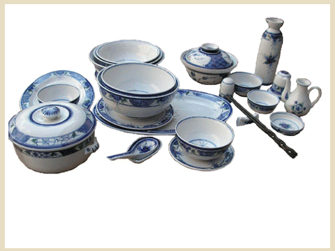 -Origin: Bat Trang Workshop -This set consists of bowls, plates, spoons, chopsticks, salt pots, etc. -They are made of ceramic with white and dark blue enamel. They are decorated with dark blue enamel on white enamel face. A collection of kitchenware will make your kitchen more beautiful and they also make your meal better. -Usage: a gift for friends and relatives. A beautiful kitchenware in hotels, restaurant and houses. -Price: 28$. FOB/ Hai Phong Port