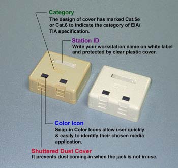 Cat. 5e / 6 Duplex Surface Mount Boxes Accommoda two voice or data communication ports with Station ID, Color Icon & Shutter. It is available in 8-conductors with or without shielding and 10-conductor without shielding. The unit installs quickly using KRONE or 110 Type IDC for 22-26 AWG inside wiring.