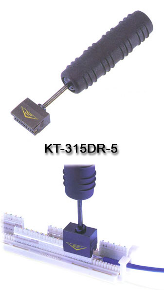 Item No.: KT-315DR-5 For use on Lan and Telecom, seating 5 pairs UTP (24 AWG) at a time. Suitable for both 110 type cable side and cross-connect side terminals blocks. The termination block heel w/blades are changeable and reversible. One end for seating and cut off wires, and the other end for seating wires only. |