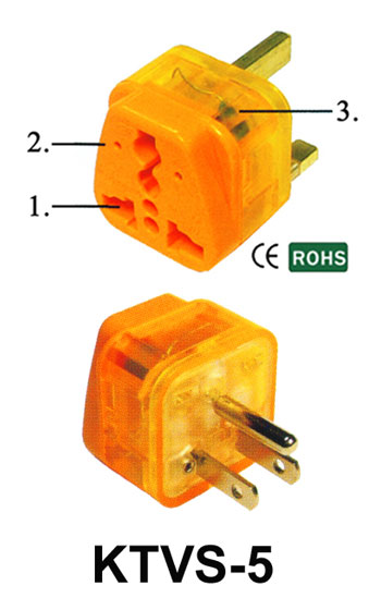 Item No.: KTVS-5 Female Socket can accept different plugs all over the world. (V) With voltage indicator (S) With surge protector. World Patented. CE Approval. RoHS Compliant Rated: 10A 250V / 15A 125V