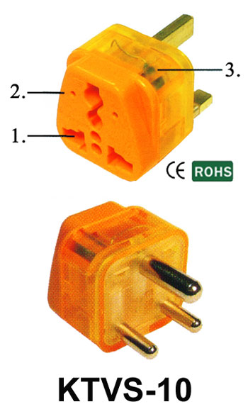 Item No.: KTVS-10 Female Socket can accept different plugs all over the world. (V) With voltage indicator (S) With surge protector. World Patented. CE Approval. RoHS Compliant Rated: 10A 250V