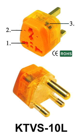 Item No.: KTVS-10L Female Socket can accept different plugs all over the world. (V) With voltage indicator (S) With surge protector. World Patented. CE Approval. RoHS Compliant Rated: 15A 250V Suitable for Area: Large South Africa, India. |