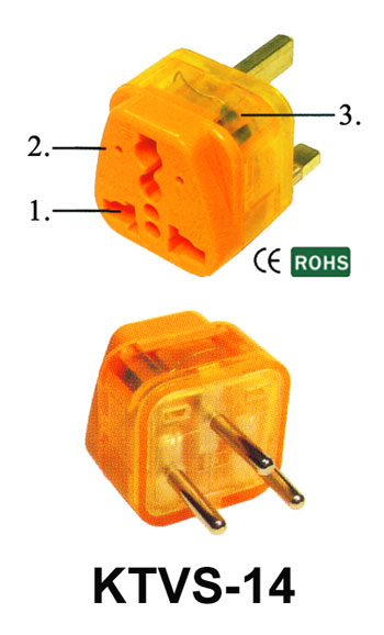 Item No.: KTVS-14 Female Socket can accept different plugs all over the world. (V) With voltage indicator (S) With surge protector. World Patented. CE Approval. RoHS Compliant Rated: 10A 250V Suitable for Area: Egypt, Israel, U.A.E |