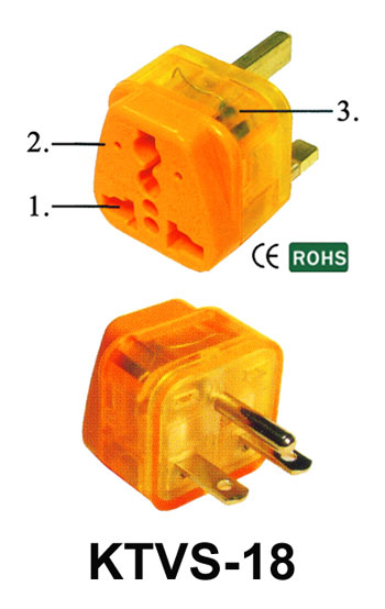 Item No.: KTVS-18 Female Socket can accept different plugs all over the world. (V) With voltage indicator (S) With surge protector. World Patented. CE Approval. RoHS Compliant Rated: 15A 250V Suitable for Area: Taiwan, U.S.A, Japan,Canada. (220V only) |