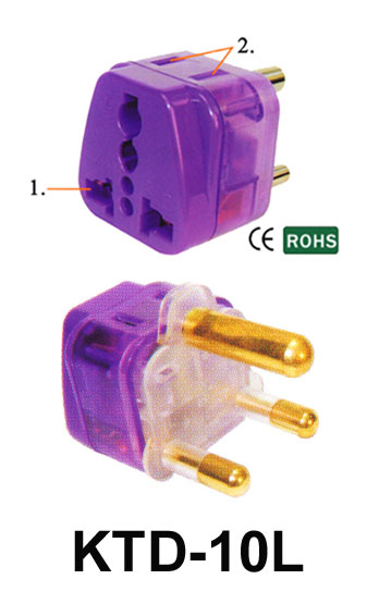 Item No.: KTD-10L Female Socket can accept different plugs all over the world. With NEMA-1-15R Receptacle. World Patented. CE Approval. RoHS Compliant Rated: 15A 250V Suitable for Area: Large South Africa, India. |