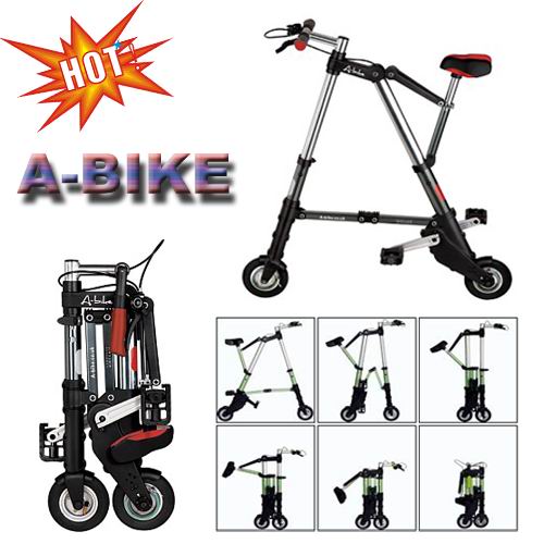 Features: 1) Folding A-bike is incredibly small and you can take it on public transport that has a no-bicycle policy; 2) Folding A-bike only weighs approximately 5.6 kg (12.6 lbs); 3) Folding A-bike utilizes automotive grade, engineering polymers for its structural components, saddle and handlebars and has a level of stiffness, fatigue & impact resistance comparable with aero-grade aluminum; 4) Folding A-bike also has a highly efficient, two-stage chain transmission that incorporates a high quality freewheel and is totally enclosed to protect clothing from grease; 5) Folding A-bike also has very small pneumatic tires that, based on recent valve developments, offer an extremely comfortable ride. The tire's inner tubes can be removed and repaired in the same way as a larger bicycle tire; 6) Folding A-bike can be folded inside 10 seconds into a compact 26?x 12?x 6?