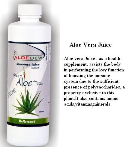 | Aloe vera Juice , as a health supplement, assists the body in performing the key function of boosting the immune system due to the sufficient presence of polysaccharides, a property exclusive to this plant.It also contains amino acids,vitamins,minerals. |