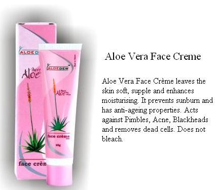 | Aloe Vera Face Crème leaves the skin soft, supple and enhances moisturising. It prevents sunburn and has anti-ageing properties. Acts against Pimbles, Acne, Blackheads and removes dead cells. Does not bleach. |