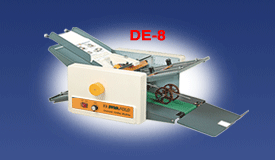 MODEL DE-8 Dimension 1055(W) x 565(L) x 400(H) mm Weight 48 kgs Paper Size 2"x2.75"~14"x21.25", 50x70mm~350x540mm Paper Weight 13~110lbs, 30~220g/m2 Folding Speed 22000 pcs / hr (A4 copy paper, single fold) Digital Counter 4 digits, auto-stop device (optional) Folding Type Manual Micro-Adjustments Power 110V, 220V, 240V 50/60Hz