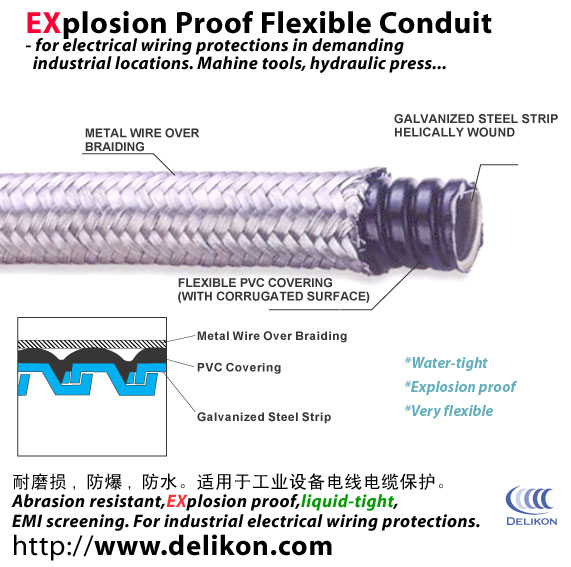 Constructions & features: 1)The core made of galvanized steel strips, hellically wound with PVC covering. Providing good mechanical protection and water tightness. 2) Metal wire over braiding provides increased pressure rating (explosion proof),abrasion resistant and EMI shielding.